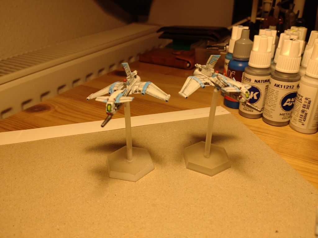 Грунтовка Vallejo White, базовые цвета AK Medium Grey и Ducat Blue, проливка Vallejo Black Wash, доводка сборной солянкой Vallejo+AK.