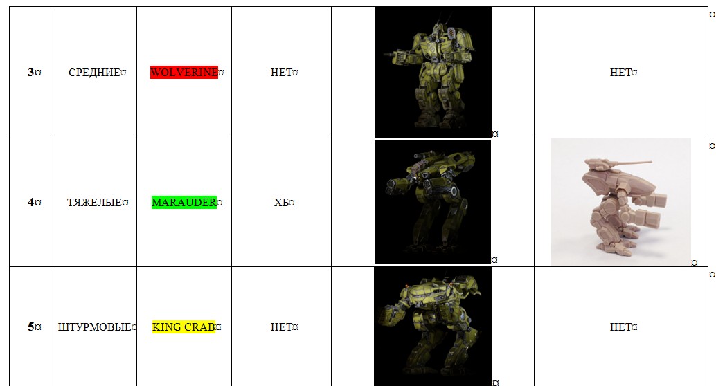 Kuntar писал(а):2. Есть где арт/нормальные качественные скрины мехов МВО после пака Второй Волны? Готов сам забахать понятную табличку.