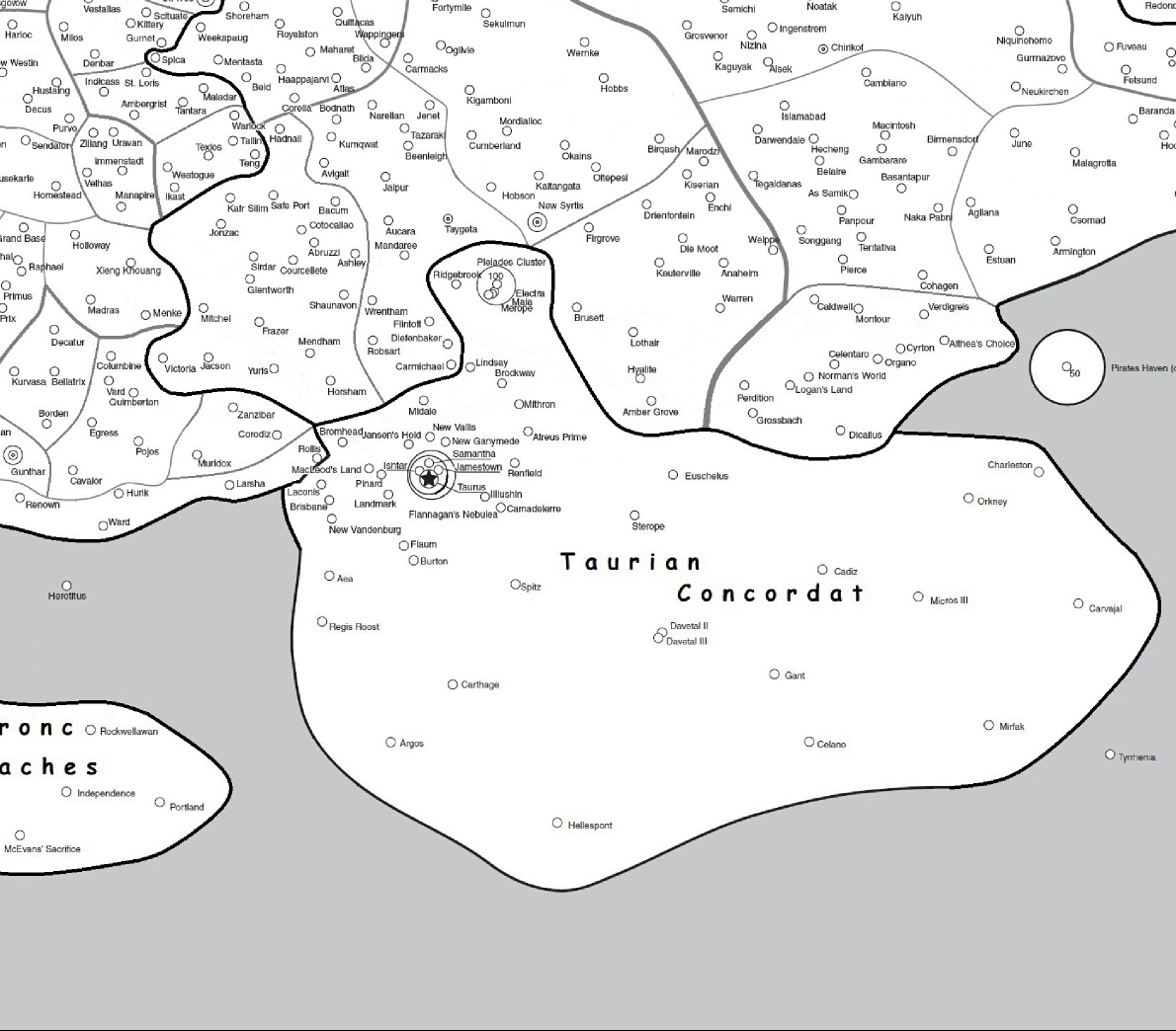 Уже к концу 70-го года таурианская военная машина забуксовала: накопленные запасы истощились, и темп восполнения потерь упал. Ещё в 69-м Хасеки отбили у быков Брюсетт, Лотарь и Гиалит, а к Рождеству приурочили перенос войны на территорию противника -- наступление на Эмбер-Гроув. Четырнадцатью месяцами позднее -- в феврале 71-го -- фронт рухнул: в течение нескольких недель Флинтофт, Дифенбейкер, Кармайкл и Мидэйл вернулись под руку Хасеков; одновременно войска Круцисской марки начали операцию "Матадор" -- массированное наступление на спинвардную часть Конкордата. Первыми под удар попали Челентаро, Органо, Сиртон и Альтеас-Чойз; в течение четырёх-шести месяцев наступающие войска Дэвионов перемололи их оборону, и под ударом оказались уже Мир Нормана, Земля Логана, Пердишен, Гроссбах и Дикаллус.