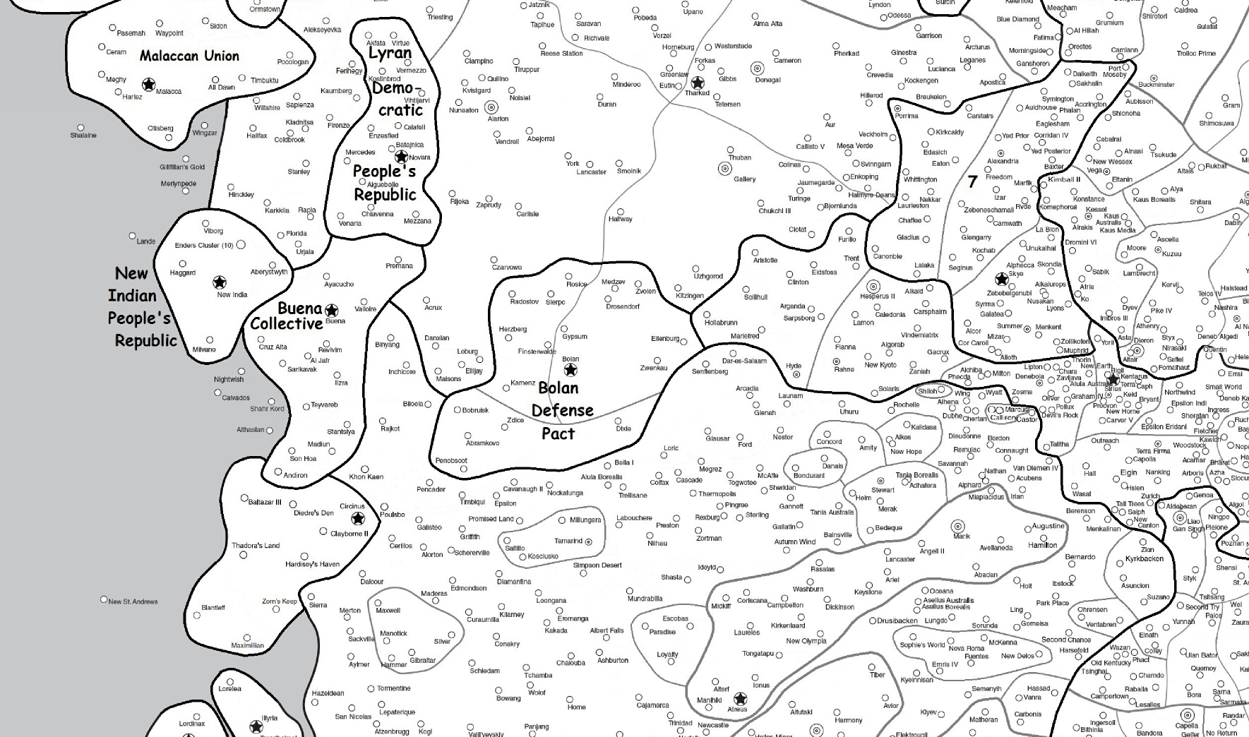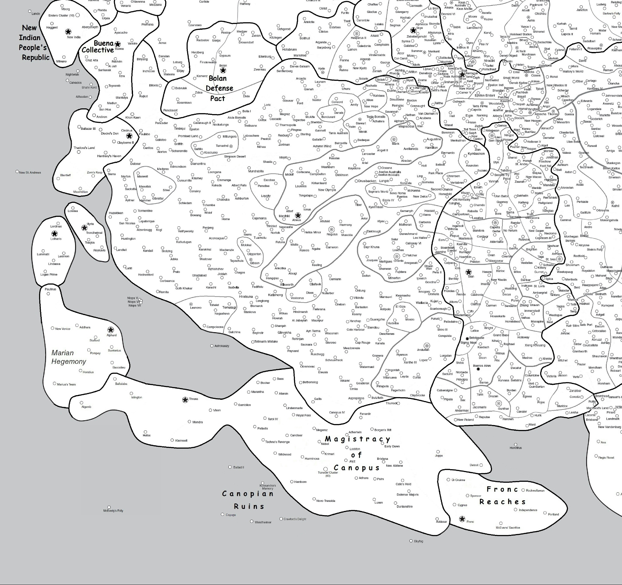 Это мы и видим на карте конца 70-х: слегка располневшая Конфедерация, хапнувший тройку лигистских (а вообще, как бы исконно канопианских) планет Магистрат, независимый, потерявший Риерсон, но присоединивший к себе немного мелочи Андуриен.