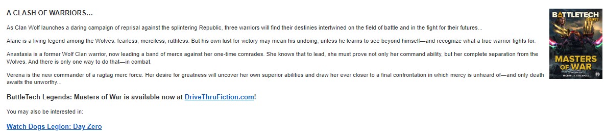Meanwhile, others who do not agree with Anastasia’s decision strike out on their own. Some join other mercenary units, another finds his purpose on the gaming world of Solaris VII. But one thing is for certain: as the Republic of the Sphere continues to fall apart, new factions and rivalries arise as the leaders of each planet left on its own adapts to this dangerous new universe. And the surest way to protect a planet is by hiring mercs…because the best defense is a good offense…